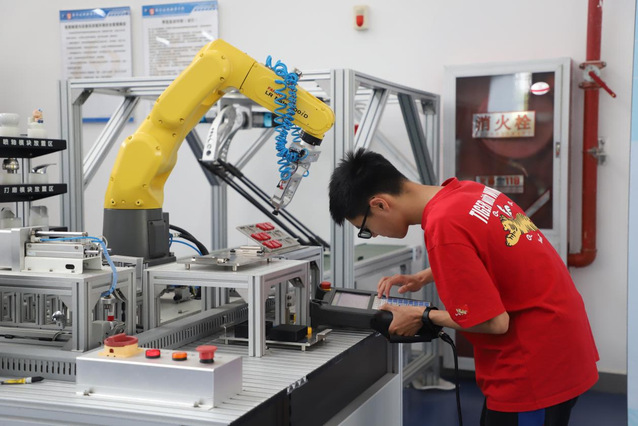 为了活动的顺利进行,2021级电子信息工程技术专业的同学们都提前做好准备,对机器人设备进行了多次调试,并设计展示内容。智能汽车教研室教师蔡琦婧向代表们介绍了实训工厂的设备组成与教学功能,同学们则熟练的操作机器人设备、现场示教和编程,演示了机器人搬运与装配、斜面运输、绘画等作业。