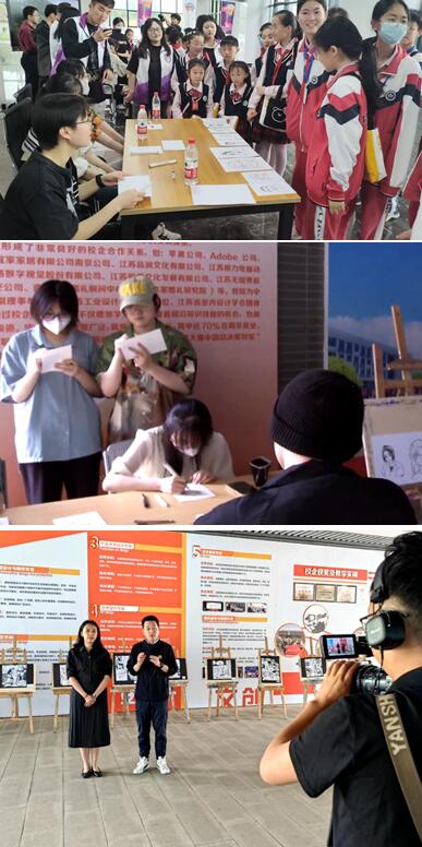 5月17日下午,正值我校在溧水校区举办中小学职业体验开放活动,在科创楼一楼举办的Q版人物肖像绘制活动现场火速吸引了众多前来体验的中小学生。同学们在此次活动中为前来体验的小观众们快速创作与绘制了一些Q版肖像漫画,引发了小朋友们的热烈反响。在用自己的创作给观众们带来了参与感、互动感与快乐的同时,同学们也从中锻炼与提升到了自己的相关设计技能,如绘画技术的提升、人物肖像特征的抓取、绘画速度的把握、与观众交流沟通的能力等。5月18日下午,肖像绘制活动转场到明德长廊举行,同样吸引了诸多师生前来体验,一些同学在被画的同时也尝试去进行了一些简单的绘画创作体验,观众们也在此次互动中了解到一些和肖像漫画相关的知识。此次活动还吸引了南京市和溧水当地媒体前来采访报道。
