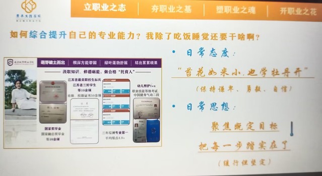 榜样力量筑梦启航。“新星”辅导员工作室坚持立德树人,结合康养工程学院职教周的相关活动,开展了优秀学生故事分享会5月181900-2030分享会如期进行,江苏省最美职校生标兵徐若桐,江苏省育婴员大赛学生组一等奖唐慊,江苏省17届职业规划大赛三等奖徐文生,江苏省职业技能大赛导游赛项三等奖赵雪,江苏省建筑识图比赛三等奖杨雨为同学们带来了他们的成长故事。全院100余名学生在线参加了分享会。