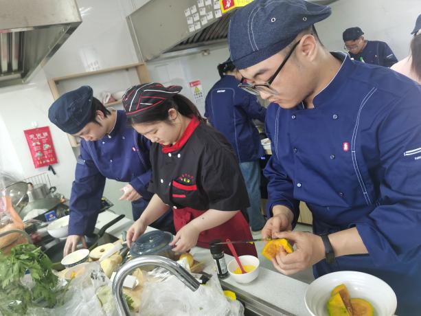 活动伊始,各组根据主题要求布置展台,展示营养食谱、食品标签。然后各组按照设计好的菜单进行营养餐制作,或蒸或煮,或炒或炖,荤素搭配,五色俱全。评委老师巡视观察各小组成员的动作技能、食材搭配、卫生安全等。