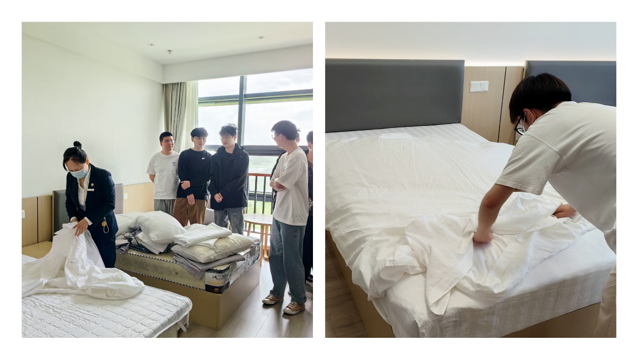 《民宿前台与客房服务》是民宿管理与运营专业的核心课。客房服务包括了客房部的基本知识、操作流程以及服务技巧等方面的内容。为了提高学生们客房实操技能,在后勤处、装信处的支持下,老师带领学生在科创园8楼的标准间进行为期8周的实训操练。具体内容包括甩床单定位、套被套和枕头、铺床包45度角以及擦拭浮灰、打扫卫生间等工作任务。