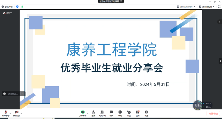 高山仰止,景行行止。自古以来,榜样就是引领我们前进的明灯。为深入贯彻党的二十大精神,落实党中央、国务院关于“稳就业”“保就业”的决策部署,进一步激发广大学子的就业热情,提升就业能力,531日晚1900康养工程学院举办优秀毕业生就业分享会,本次分享会邀请了我院黄立勇、殷佳婕、孙青青等优秀毕业生代表分享他们的就业经验。