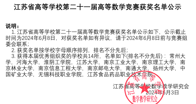 2024年5月25日,江苏省高等学校第二十一届高等数学竞赛如期举办,6月3日,在江苏省高等学校数学教学研究会网站对获奖学生进行了公示,根据竞赛组委会公布的赛果,我校智能工程学院通用能力教研室戴志娟、郭宜彬、宋彩虹和陈丽娜老师指导的学生在专科生组中表现出色,取得了优异成绩:荣获1个一等奖,2个二等奖、14个三等奖。