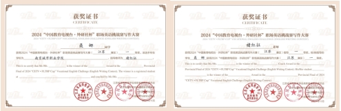 日前,2024“中国教育电视台·外研社杯”职场英语挑战赛江苏赛区写作比赛成绩公布,我校公共教学部褚红征老师指导的学生聂娜(智能工程学院23计算机应用技术1班)、袁铭悦(数字财商学院23大数据与会计2班)、王飞燕(数字财商学院24跨境电子商务3班)分别荣获一等奖、二等奖和三等奖。