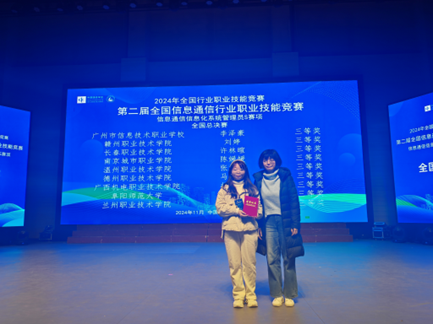 赛分为理论知识竞赛和实操竞赛两部分,赛项设计紧密贴合信息通信行业高速发展所带来的人才需求激增的趋势。经过两天激烈的角逐,智能工程学院计算机教研室教师沈娟娟凭借扎实的专业知识储备和丰富的实践经验,在职工组比赛中荣获二等奖。智能工程学院2023级计算机网络技术1班陈媛媛在赛场上以沉稳冷静的心态和精湛娴熟的技能应对各项挑战,在学生组比赛中荣获三等奖。