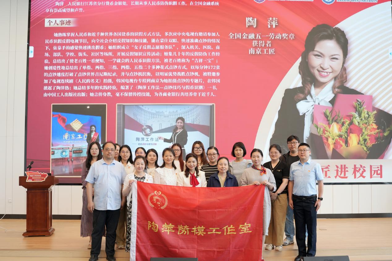 “劳模工匠进校园——事迹报告会”环节,主讲人陶萍老师的分享成为全场焦点。陶萍老师身兼多项荣誉,是中国人民银行先进工作者、全国金融五一劳动奖章获得者、全国巾帼建功标兵以及首届十大“南京工匠”。她凭借精湛技艺,熟练掌握人民币和近千种世界各国货币的识假方法,多次受邀在央视节目中传授反假知识。不仅如此,她蒙眼点钞挑假币的绝技令人惊叹,还成立“女子反假点愿服务队”,积极开展反假知识宣传活动。陶萍老师总结的人民币识假“吉祥三宝”方法,简单易懂,造福百姓;创新的二十多种花式点钞方式,更是打破点钞吉尼斯世界纪录,在与点钞机的较量中脱颖而出。她还编写了《陶萍工作法——点钞技巧与假币识别》,为行业贡献宝贵经验,言传身教培养了近千名商业银行骨干。陶老师讲述的奋斗故事和坚守的职业信仰,深深打动了在场的每一个人,让同学们切实感受到金融人对职业的热爱和对匠心的执着。