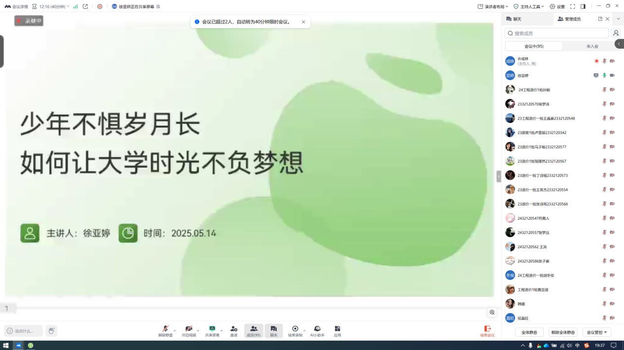 2025年5月14日,康养工程学院成功举办了一场主题为“少年不惧岁月长——如何让大学时光不负梦想”的线上讲座。本次讲座由2020届工程造价专业优秀校友徐亚婷主讲,旨在帮助在校学生深入理解学习与实践的重要性,明确大学期间的努力方向,并为未来的职业发展奠定基础。