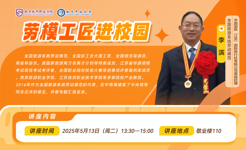 2025年5月13日下午,由校工会主办,康养工程学院分工会承办的“劳模工匠进校园活动”在敬业楼110教室成功举办。本次活动有幸邀请到全国旅游系统劳动模范、中国国旅(江苏)国际旅行社有限公司高级经理李滨,为同学们展开一场难忘的讲座学习。2023级和2024级旅游管理专业全体学生及旅游教研室教师参与此次活动。